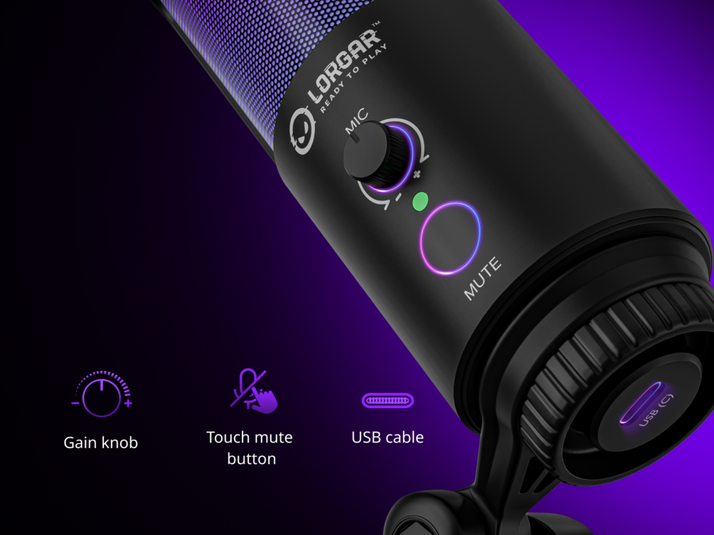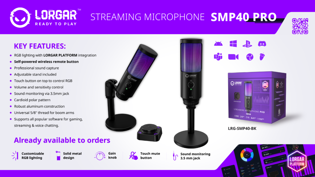 LORGAR™ Streaming Microphone Pro SMP40 carries forward the trusted design philosophy that has made LORGAR™ microphones essential tools for communication. Using the trusted foundation of the classic cardioid design, the SMP40 introduces new features for modern content creators – vibrant RGB lighting, seamless LORGAR PLATFORM integration, and an industry-first self-powered wireless remote mute button.