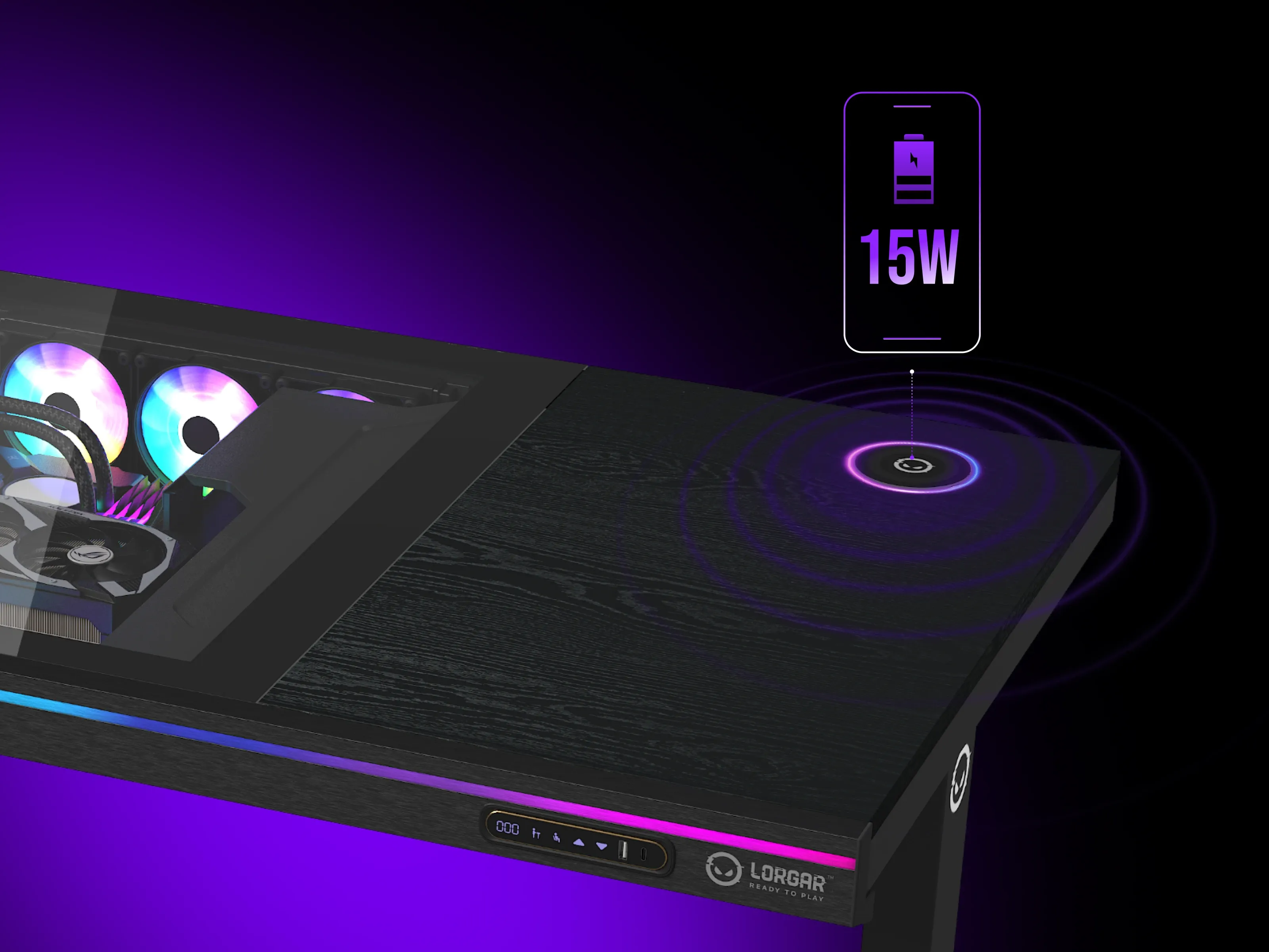 Built-in 15W wireless charging pad eliminates cable clutter for compatible devices. Dedicated USB 1A + 1C ports provide convenient charging for controllers, phones, and accessories. Smart power management ensures reliable charging without interfering with desk operation.