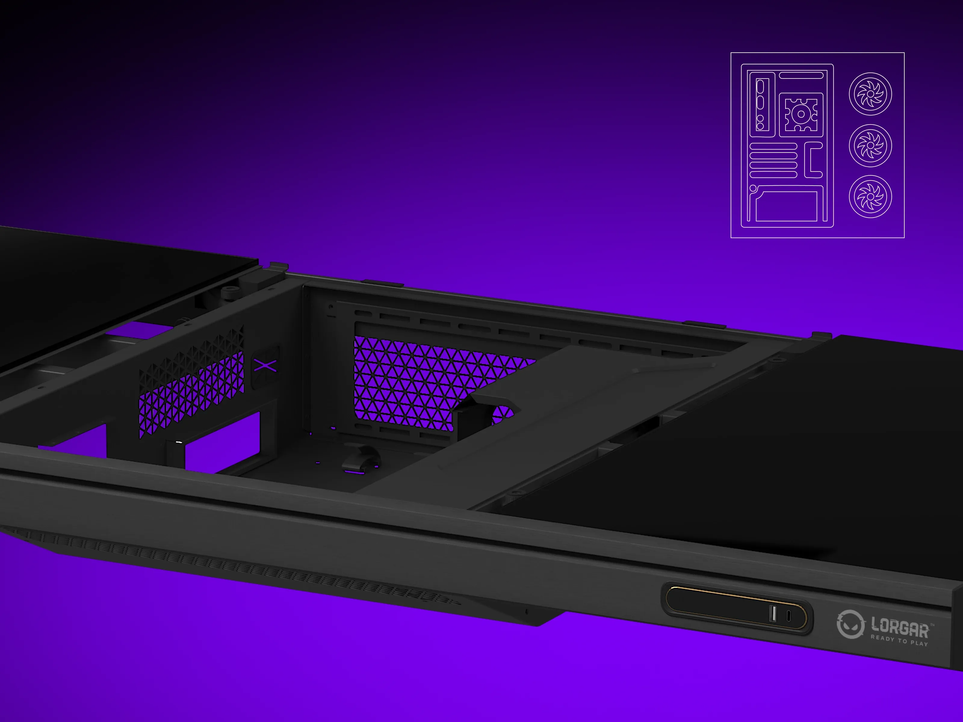 The integrated chassis delivers capabilities similar to the typical ATX mid-tower case, allowing users to build their systems inside the deck without significant compromises to regular hardware selection. The cooling system supports 360/280/240mm liquid cooling radiators, compatible with most mainstream AIOs and custom loops. Support for 3x 120mm front fans ensures optimal airflow. The chassis provides mounting points for 1x 3.5″ HDD and 1x 2.5″ SSD. ATX power supplies up to 180mm in length are supported. Front I/O connectivity includes 3A + 2C USB connections and 3.5mm audio jack, positioned for convenient access.