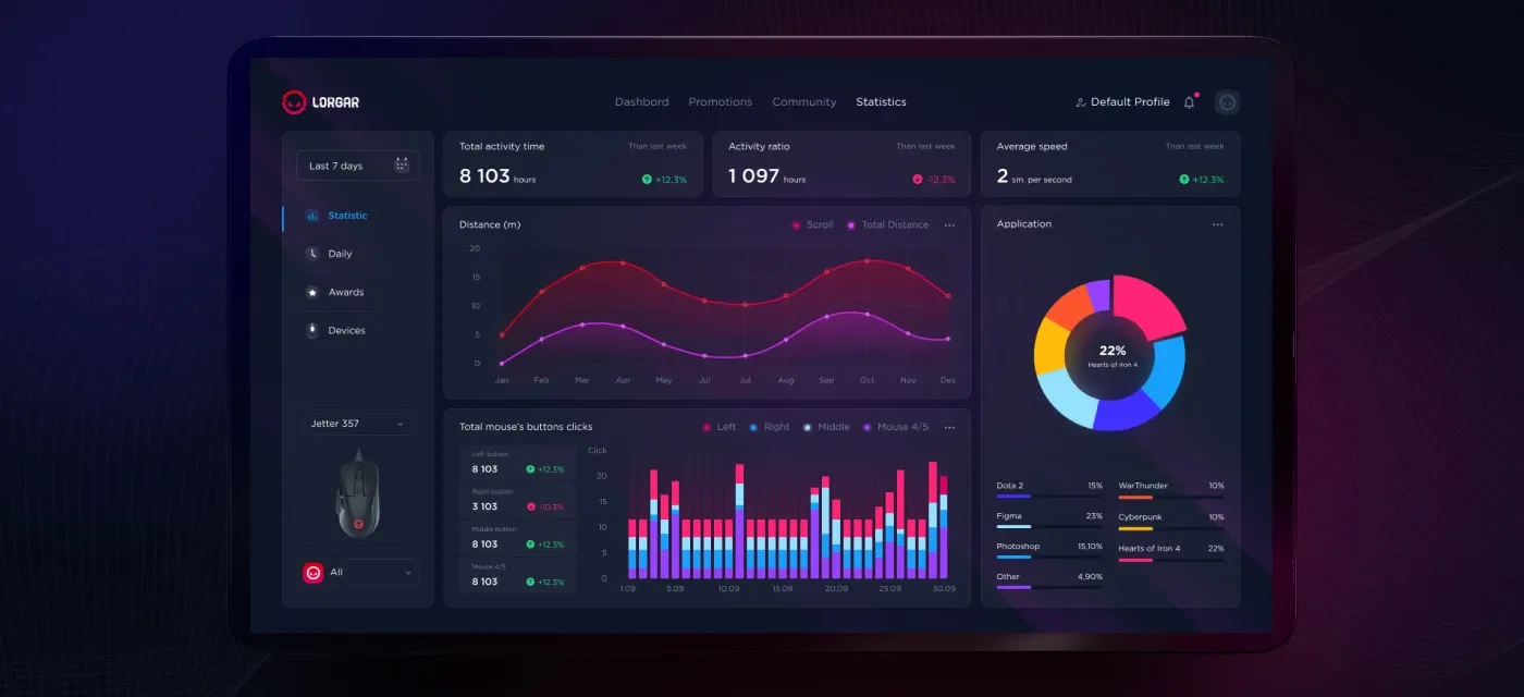With LORGAR PLATFORM, you can explore personal activity stats. The number of clicks, game speed, mouse range, and even more is available in the original LORGAR PLATFORM module.