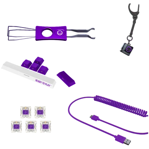 A keychain switch with keycap – you can swap it with any key on your keyboard; six replacement keycaps to match your device model's style, five spare switches, a keyboard cleaning brush to keep your device pristine, a universal switch/keycap puller for easy customization, two hand warmers for comfortable gaming sessions, a cup coaster for your desk setup, and a carrying bag.