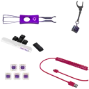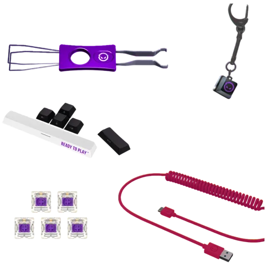 A keychain switch with keycap – you can swap it with any key on your keyboard; six replacement keycaps to match your device model's style, five spare switches, a keyboard cleaning brush to keep your device pristine, a universal switch/keycap puller for easy customization, two hand warmers for comfortable gaming sessions, a cup coaster for your desk setup, and a carrying bag for transportation.