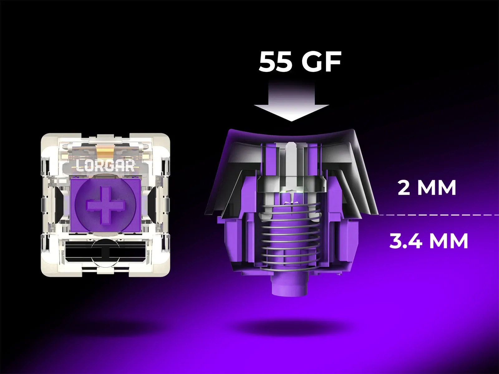 Experience premium mechanical performance with LORGAR™ «Toxic Purple» silent and pre-lubed linear switches. Engineered for gaming excellence, these switches provide a smooth, consistent feel with a balanced 55 gf actuation force. Built to last with a 50 million keystroke lifespan, they deliver reliable performance for years of intense gaming.