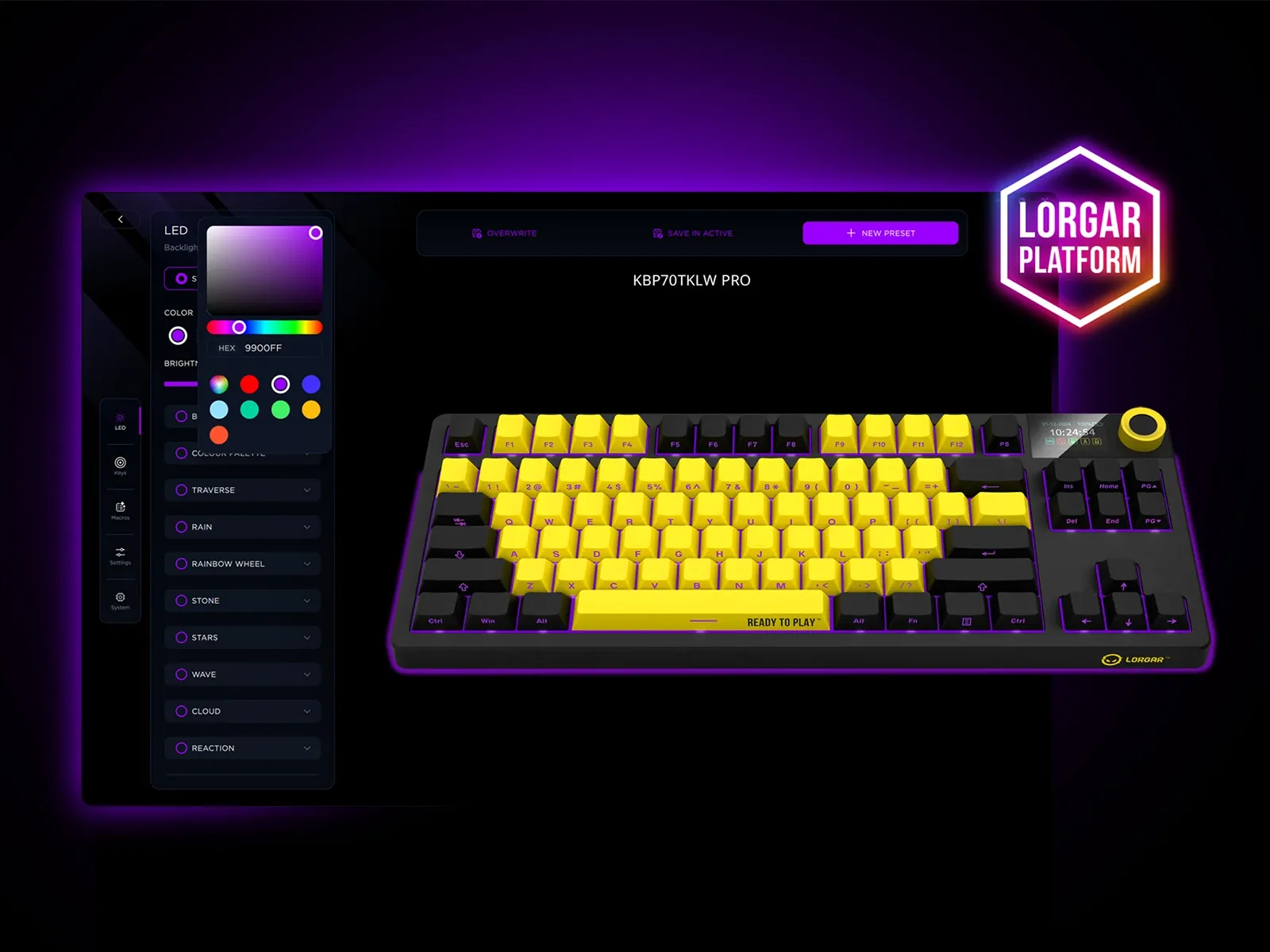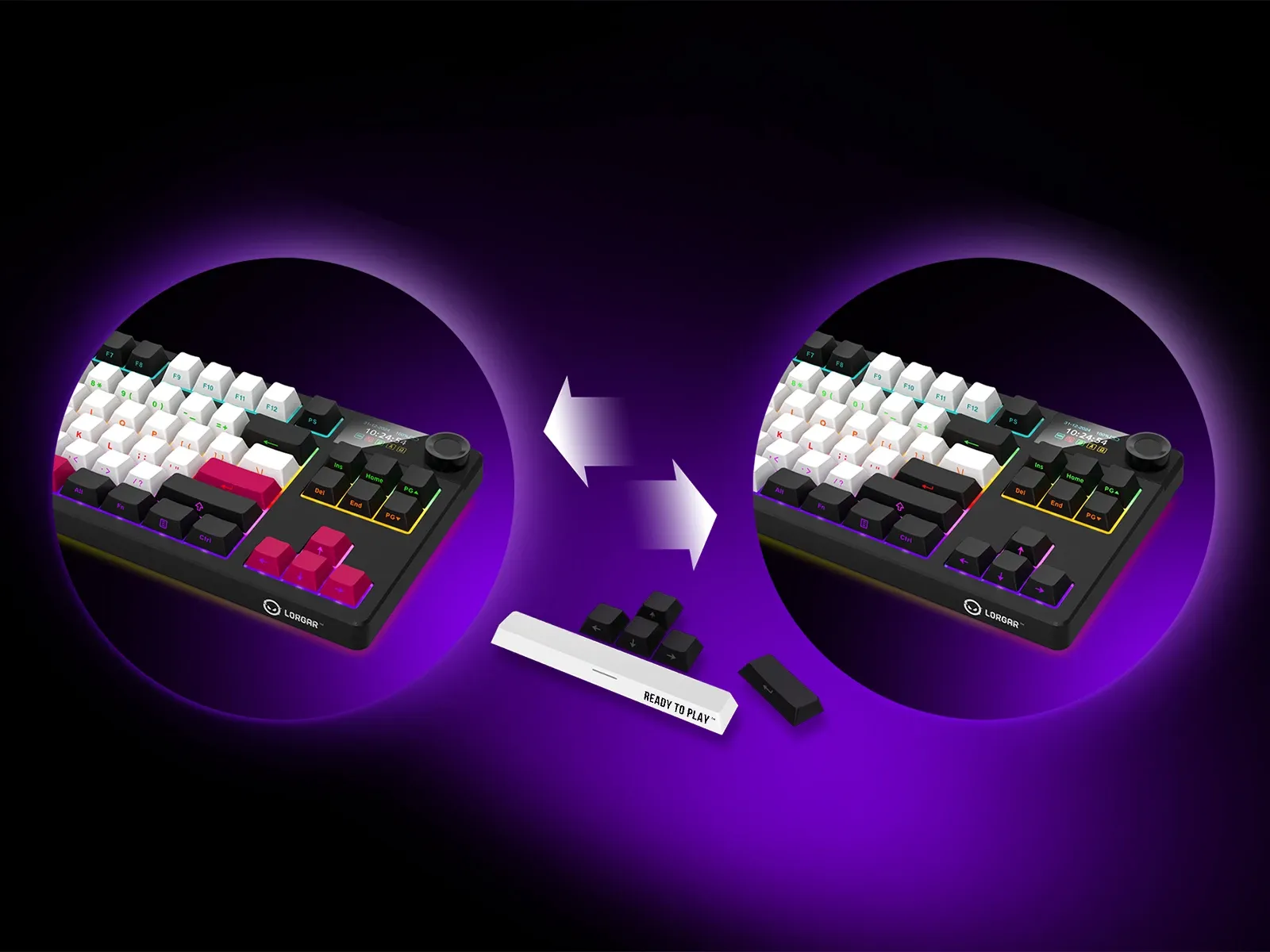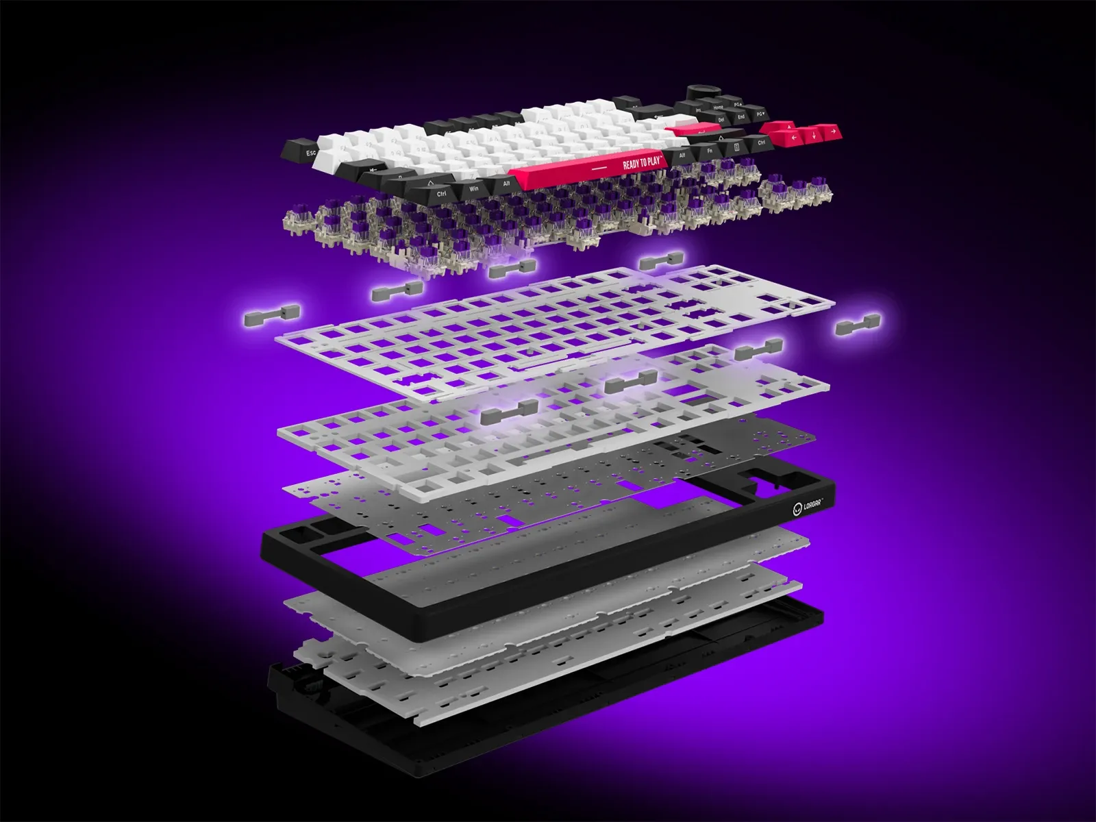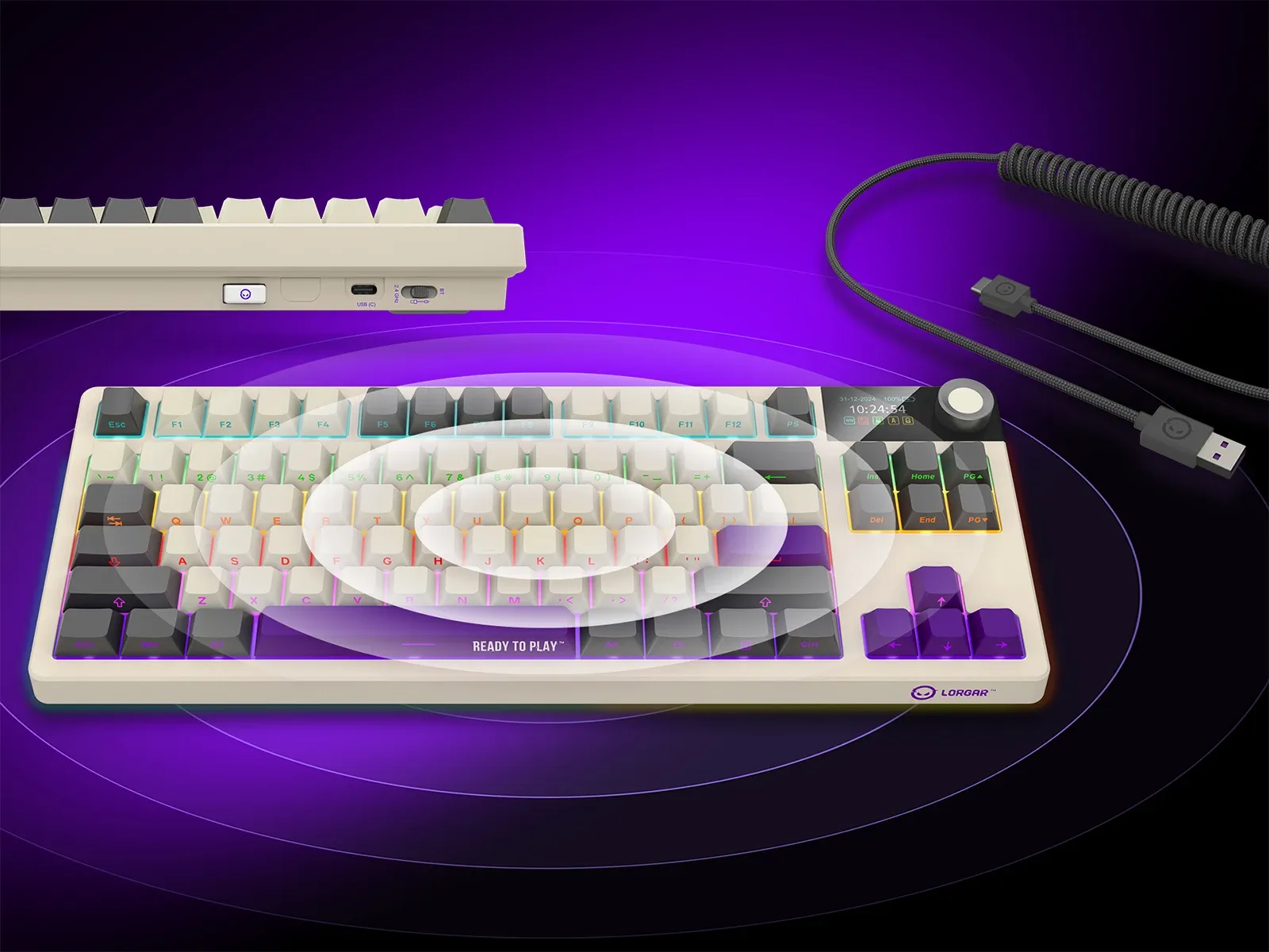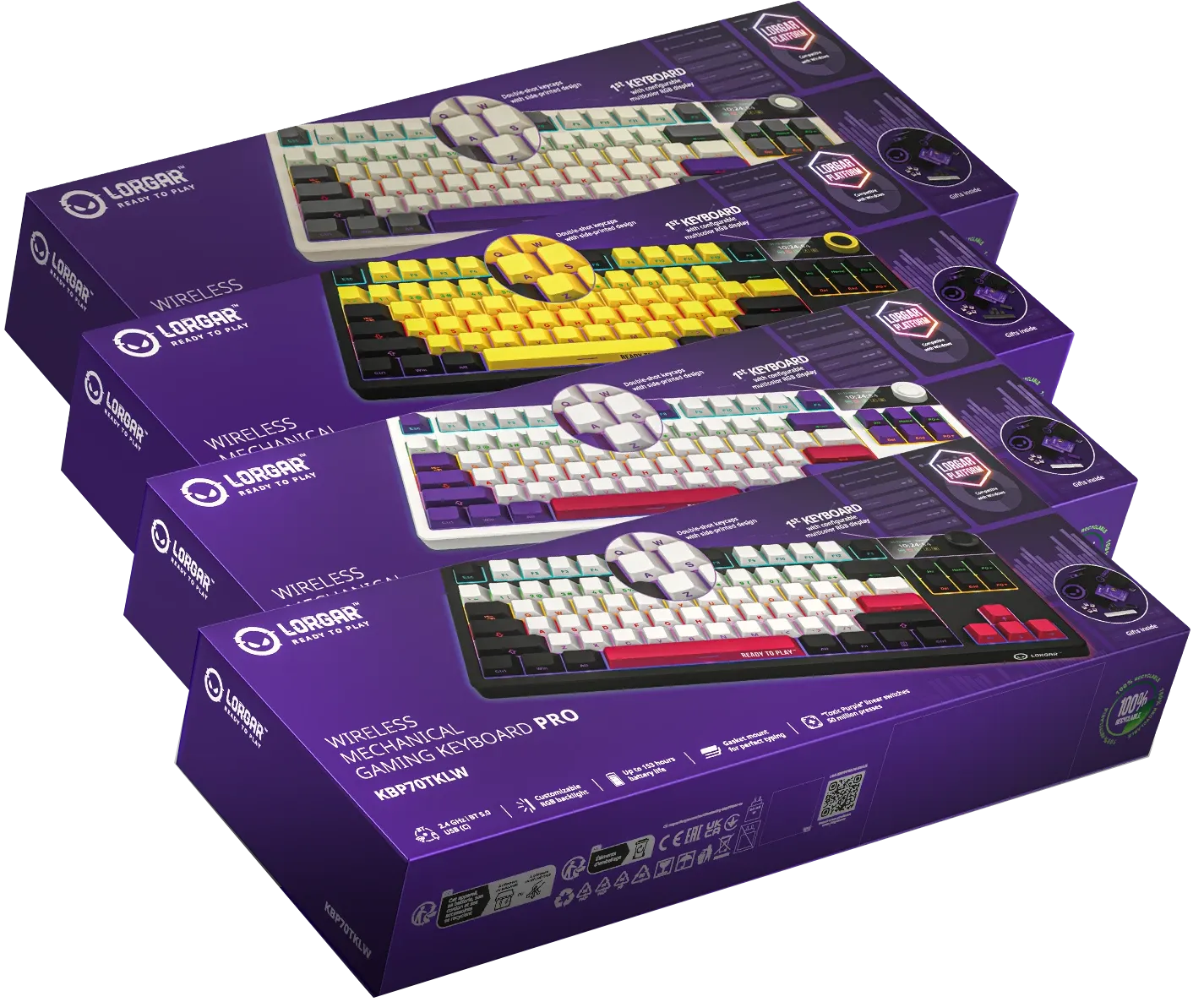 The tenkeyless layout provides full functionality in a space-efficient design. Premium double-shot PBT keycaps feature side-printed legends for clean aesthetics and clear function visibility. LORGAR™ «Toxic Purple» linear switches deliver smooth keystrokes and can be easily replaced thanks to the hot-swap capability. The gasket-mounted design ensures optimal typing comfort with perfect sound dampening.