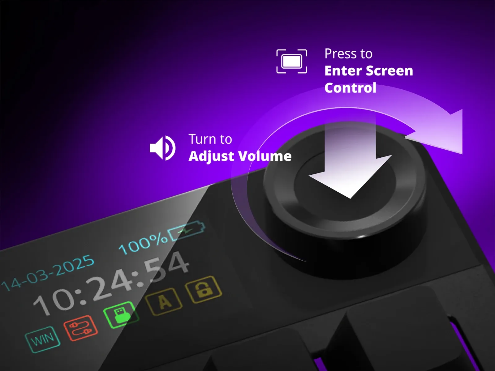 The multifunctional control provides quick access to keyboard settings and media features. Rotate to adjust volume or press to enter the options menu for lighting modes, brightness, effects, and colors configuration.