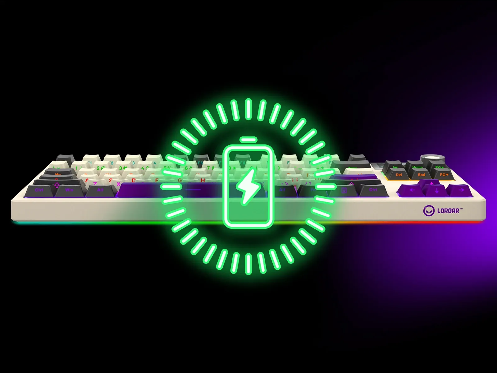 Powered by a 7,200 mAh lithium polymer battery, the keyboard delivers up to 50 hours of continuous operation with single charge. Operating time can be extended up to 153 hours with lighting off. Charging time is up to 14.5 hours, with a battery level on the display to keep you informed of the remaining power.