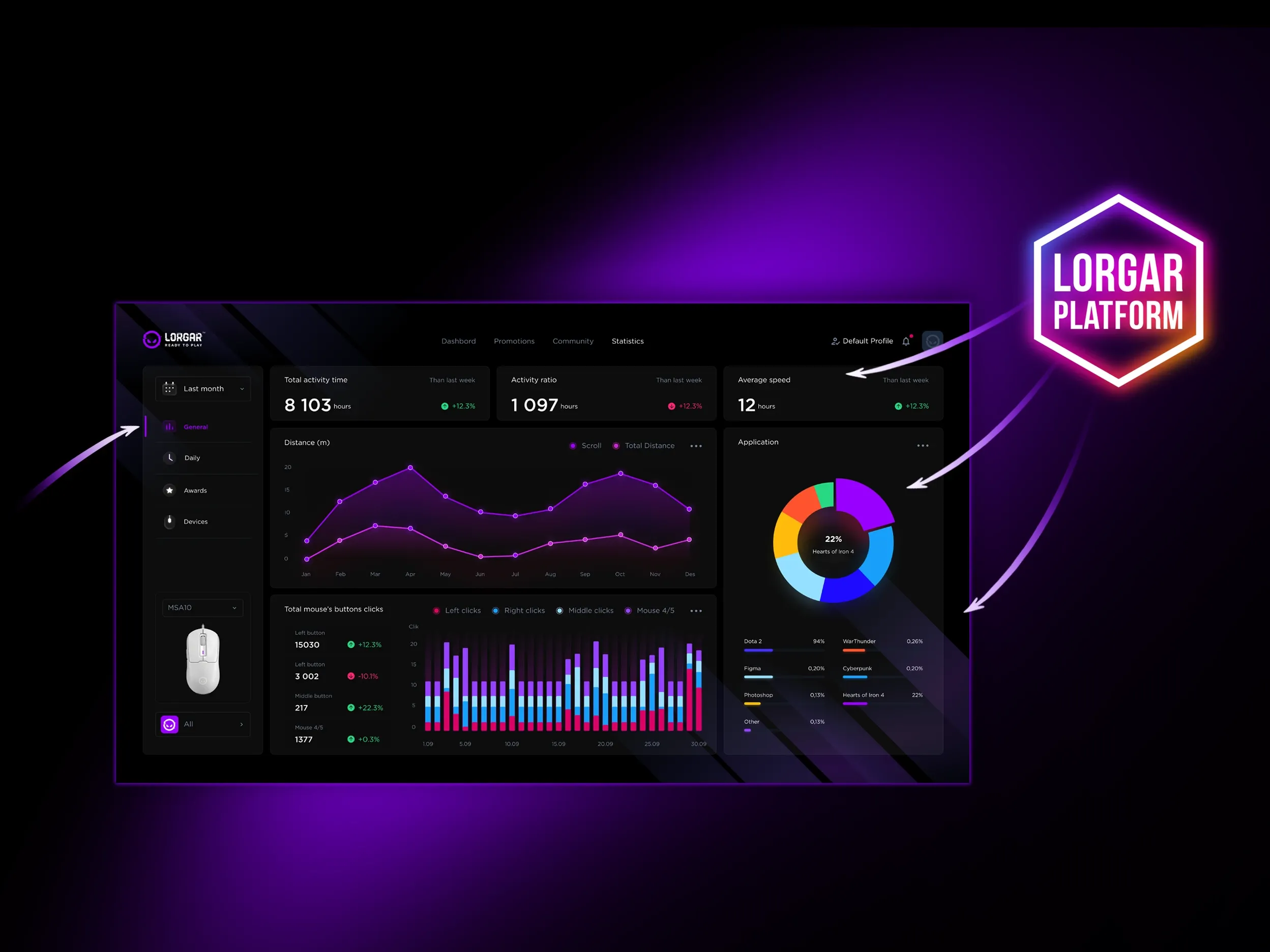 With LORGAR PLATFORM, you can easily track your device performance statistics. Monitor your usage time, cursor travel distance, mouse activity, button click counts, average speed, scroll count, and other useful metrics.
